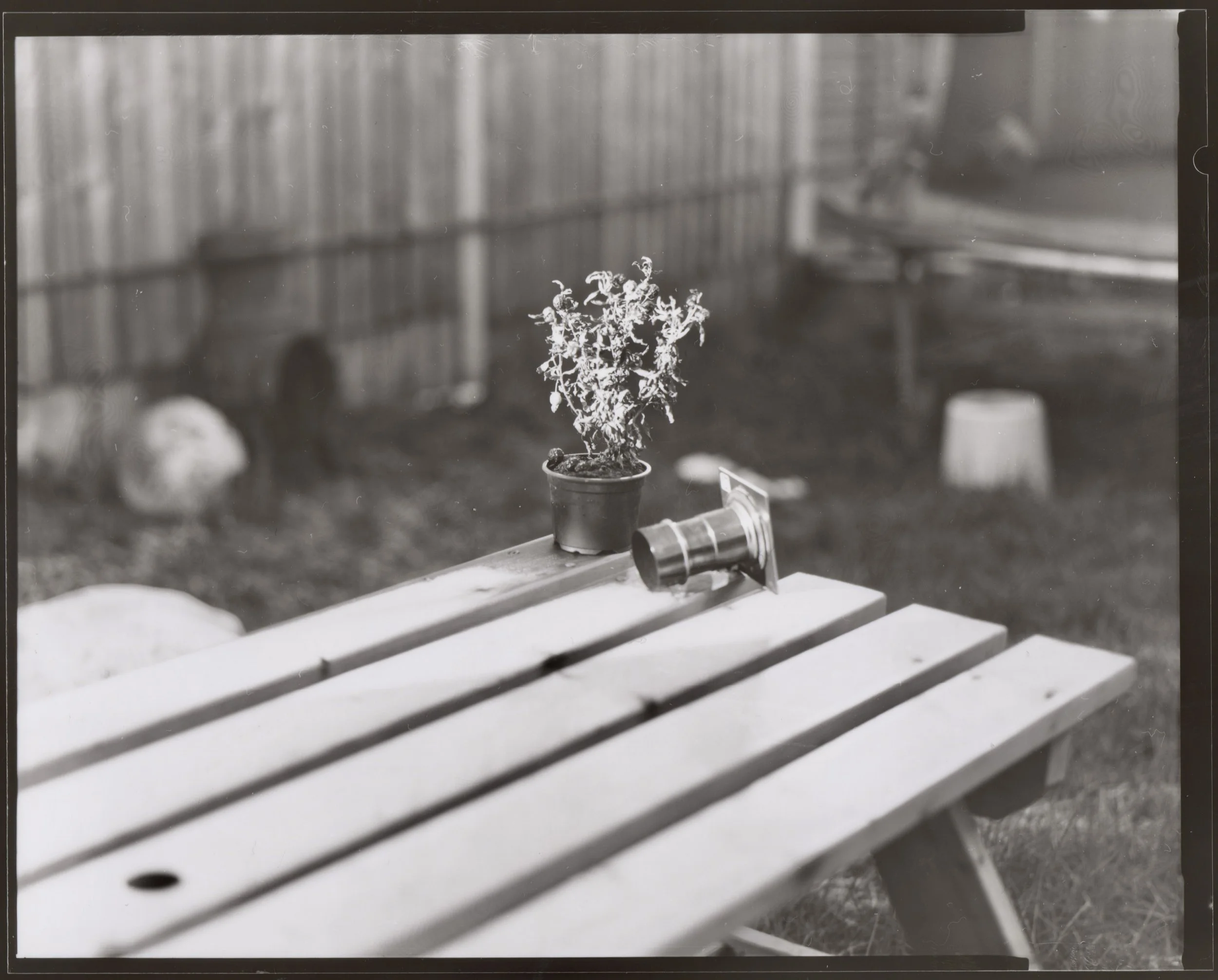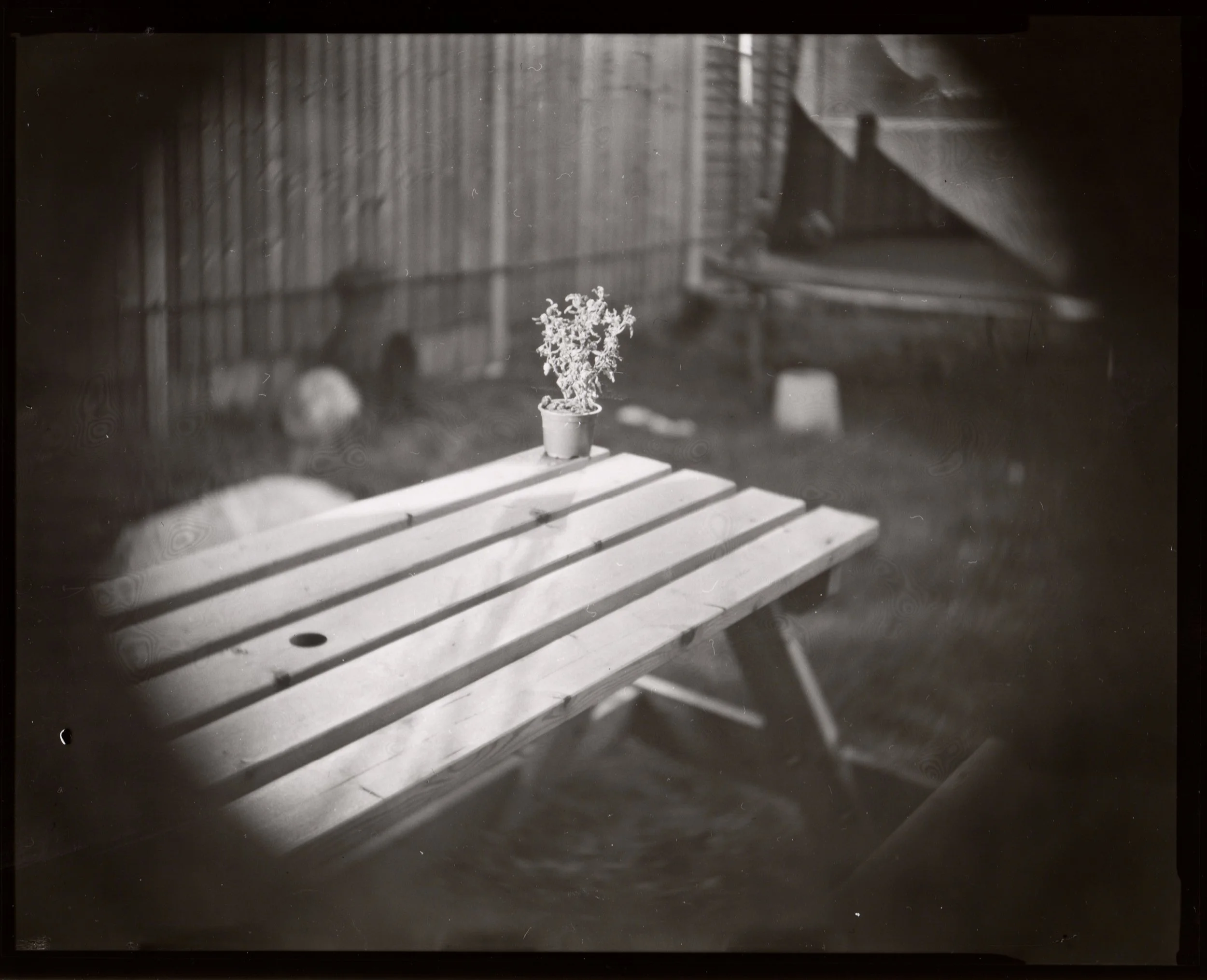 Next, I ventured outdoors, choosing a dying potted plant on a frozen picnic bench as my subject. a shaft of sunlight starting to hit the plant and corner of the bench. This time I armed myself with Ilford80 film, hoping for a bit more latitude and forgiveness with the exposure. There was still a battle with focal distance and vignetting, but all in all, a significant improvement on my first cat-astrophe. I felt like a wizard, experimenting with black magic, trying to coax the best out of this old lens.