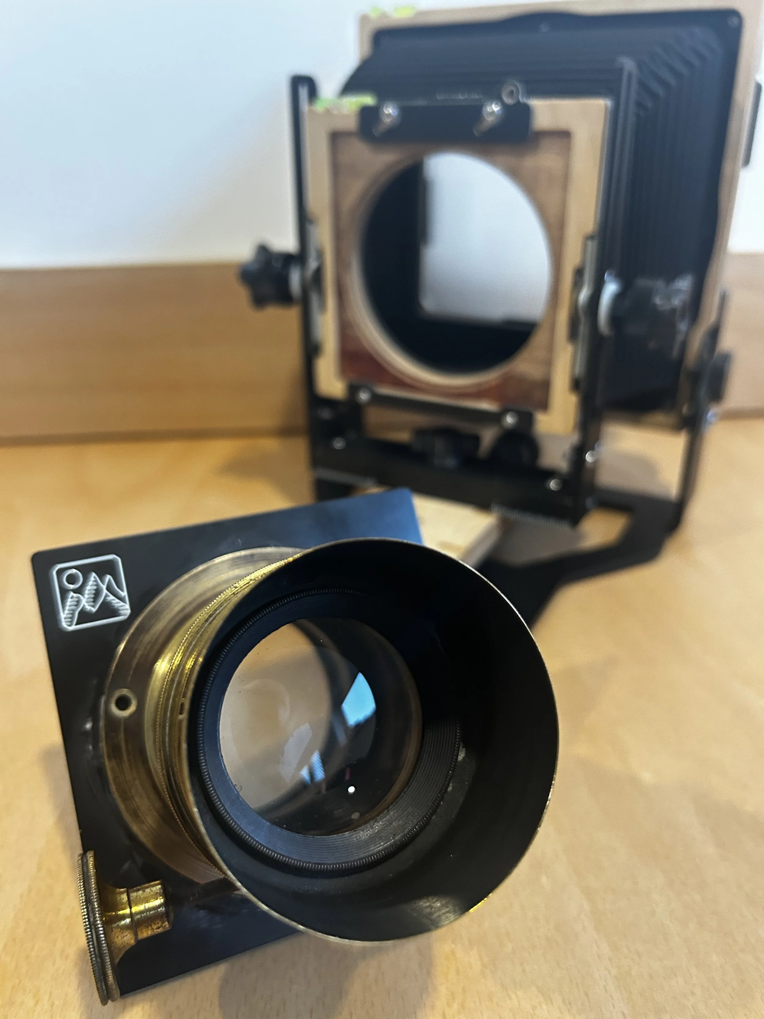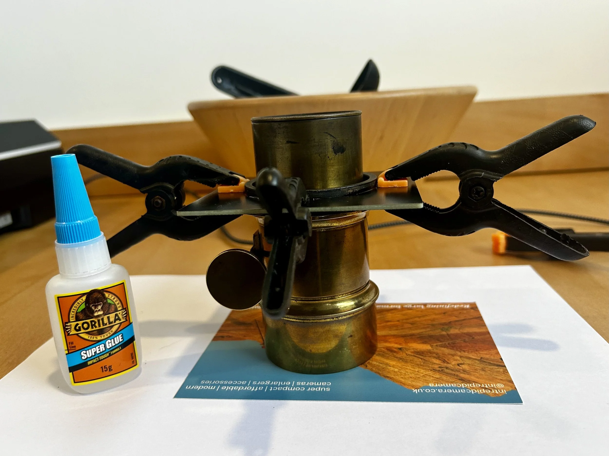 Adapting this vintage masterpiece to my modern Intrepid 4x5 camera was an adventure in itself. The task involved some DIY skills, specifically modifying a copal 3 lens board. Picture this: me, at my desk, surrounded by clamps and knives, with gorilla glue at the ready. It was not delicate operation, there may have been some choice words. But, I managed to frankenstein the old with the new, and after some trial and error, the lens was securely attached and ready for action - no selotape or elastic bands required!