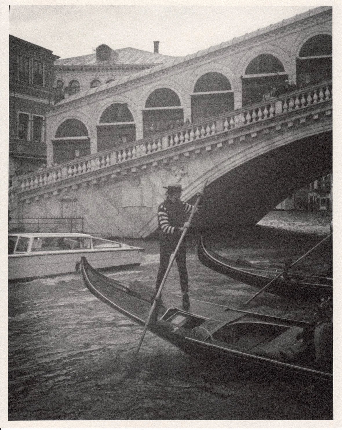 The Rialto Bridge frames were carefully printed on Ilford Multigrade Art paper, which I find renders the textures and contrasts of the scene with a tactile quality that's simply mesmerising. The first print offers a view of the bridge standing in the distance, covered in tourists, with gondolas moored in the foreground left of the Grand Canal. The second is a lively contrast, featuring a gondolier in the midst of steering his vessel through the waterways that crisscross the city, the bridge providing a stoic background.